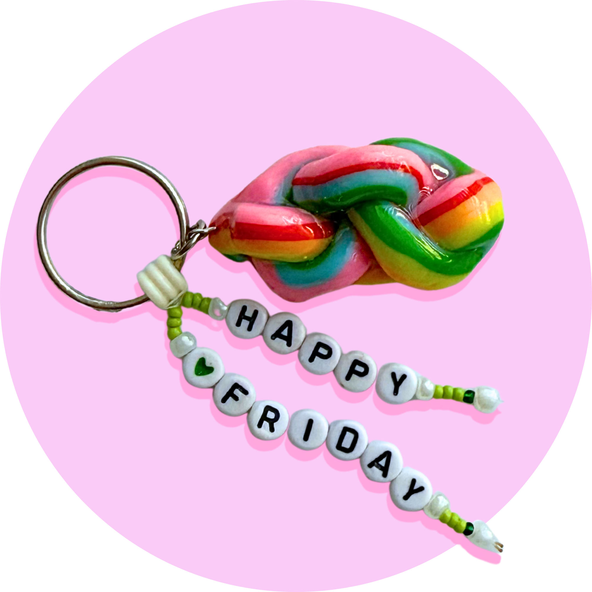 Attached to each challah is a hand-beaded charm featuring a fun on-brand Friday Baking phrase. Every bead is strung, tied, and finished by hand because apparently I like making things more complicated for myself. (No really, like my hands are cramping, but I'm having so much fun??)